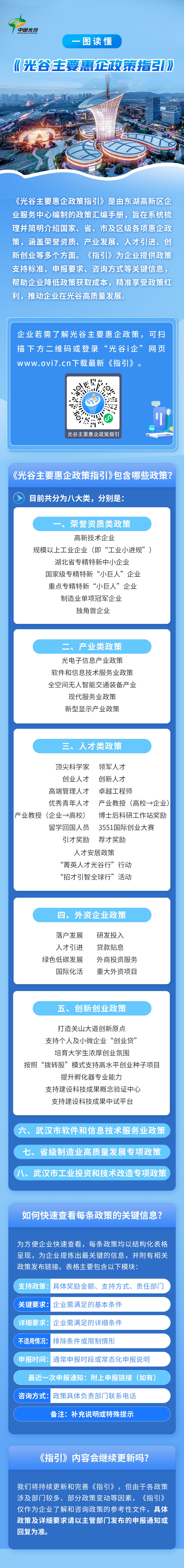 近日,东湖高新区发布《光谷主要惠企政策指引》。《指引》系统梳理省市区三级惠企政策,包含八大类政策、超百项具体条款,涵盖荣誉资质、产业发展、人才引进、外资支持、创新创业等多个维度,为企业提供政策支持标准、申报要求、咨询方式等关键信息,帮助企业降低政策获取成本,精准享受政策红利。