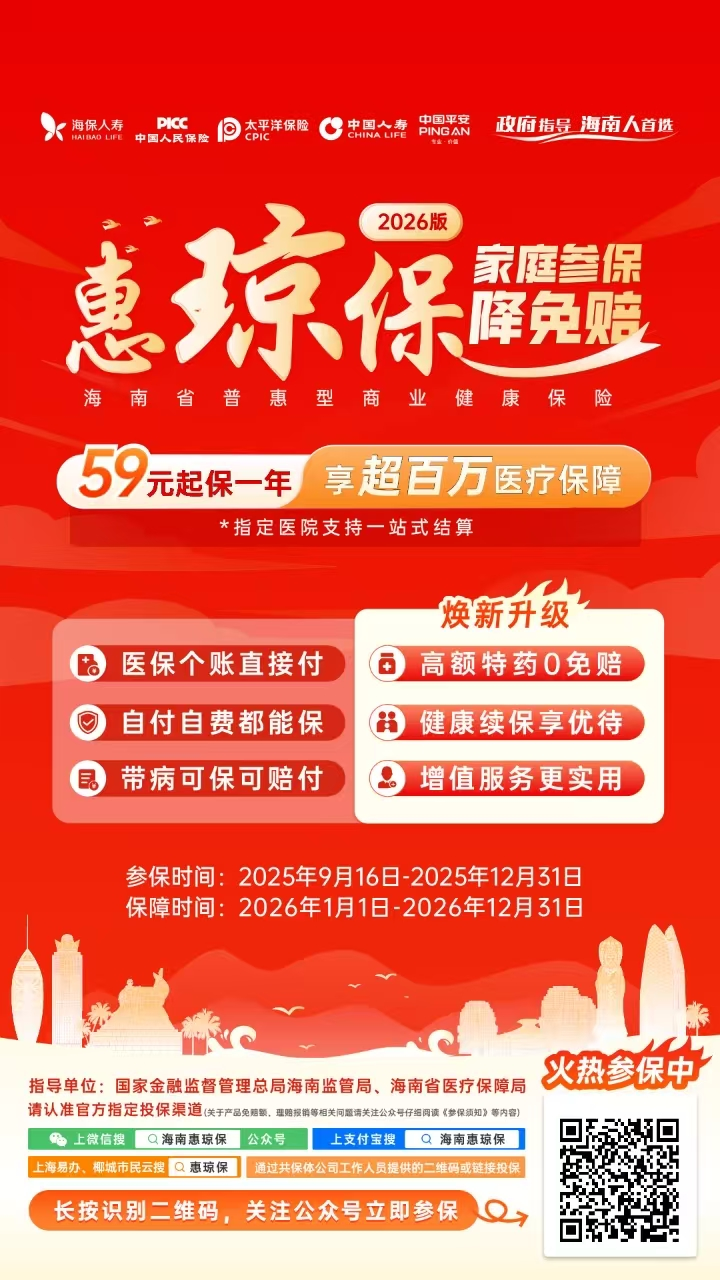 “惠琼保”2026版项目组提示,本年度参保期截至2025年12月31日,保障期为2026年1月1日至2026年12月31日。尚未投保的海南人民可通过“海南惠琼保”微信公众号在线投保,也可以通过支付宝、海易办、海南农商行、云闪付、椰城市民云在线参保,另外还可以通过13家共保体公司的专业工作人员咨询参保。