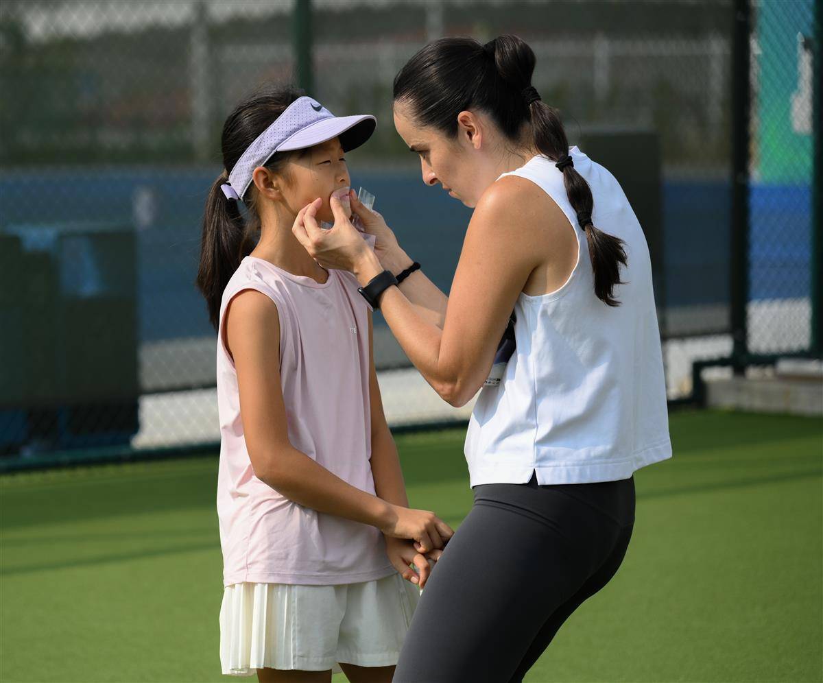 格蕾西亚借借助嘴唇贴纸,引导小球员体会运动呼吸要领。