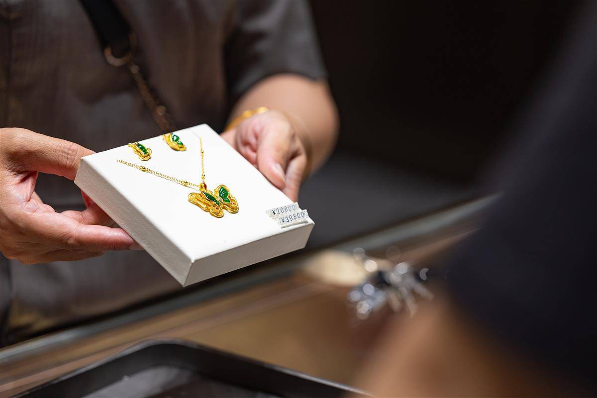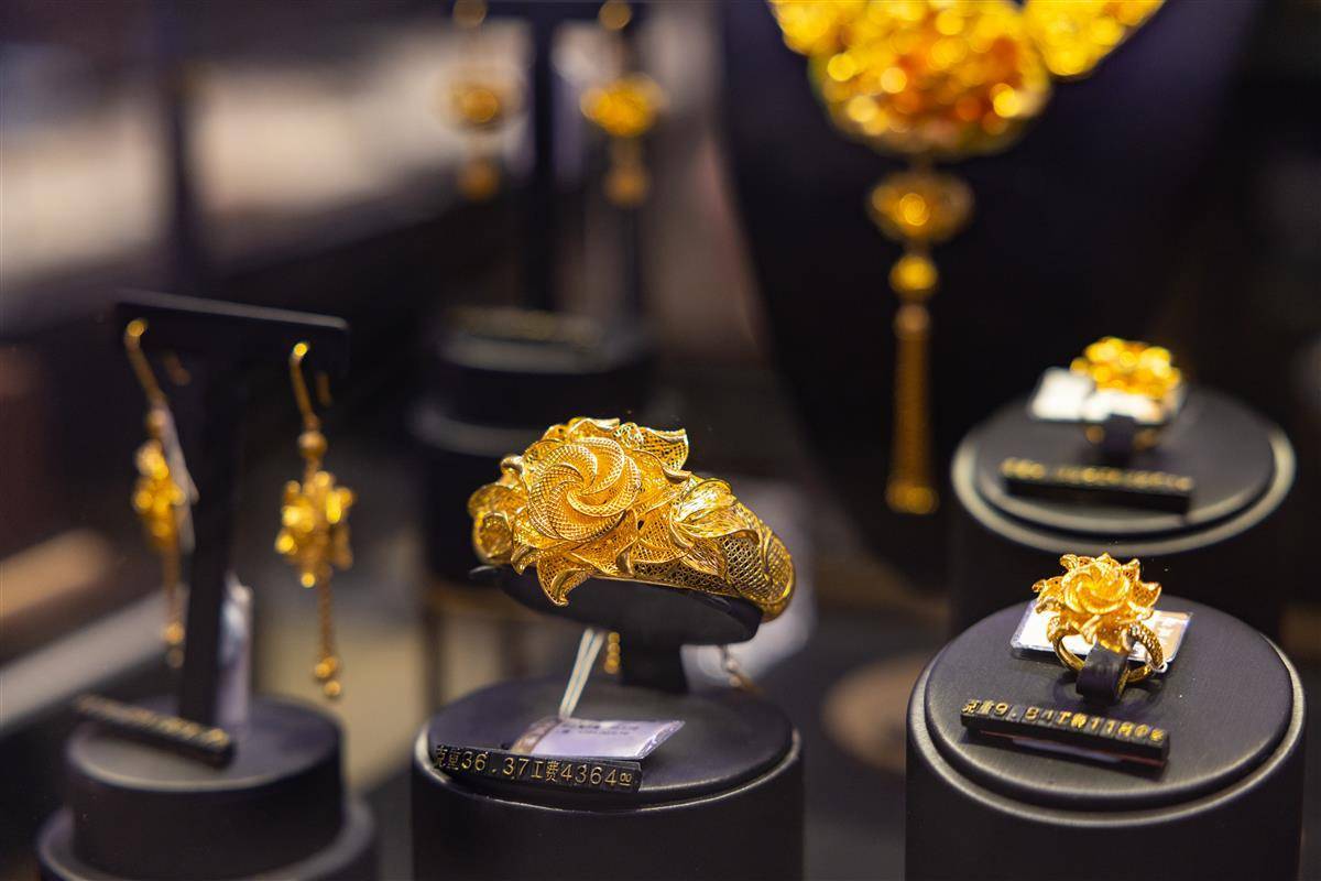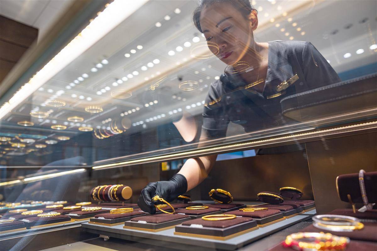 在武商MALL·世贸黄金珠宝区,工作人员展示足金产品。