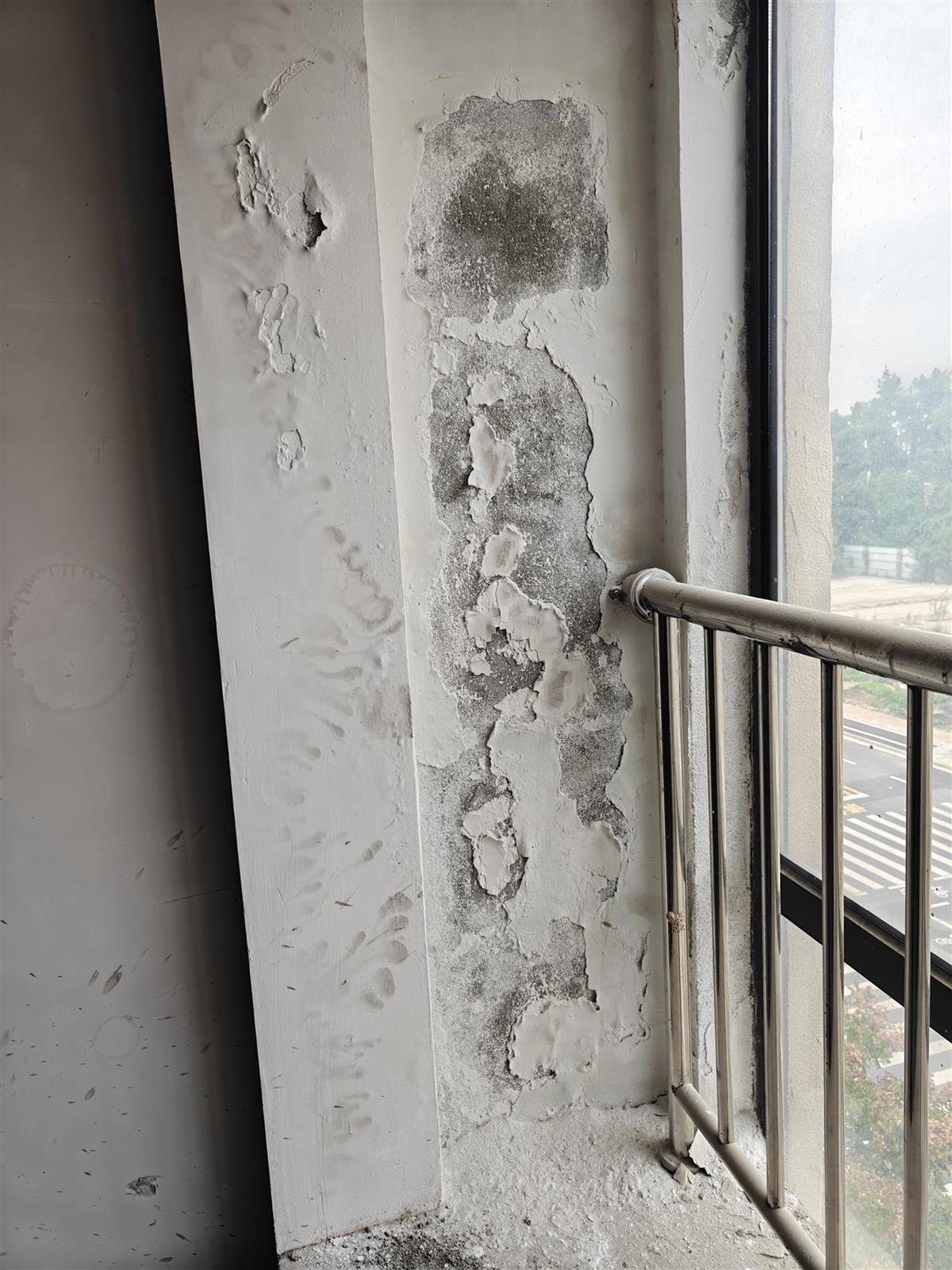 除了墙面被打洞外,漏水问题更让王先生烦心。在卧室飘窗顶部,一条水渍沿着窗沿延伸。飘窗旁的墙面已起皮,记者轻轻用手指触碰,墙皮瞬间化作粉末簌簌落下。“我之前来看过几次,发现了这些问题,当时跟物业反映,可一直到现在也没动静。”王先生无奈地说,原本想着今年装修好,春节就能在新家过年,现在却连收房都成了难题。