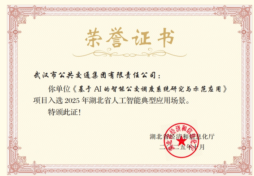 湖北日报讯(记者黄洁如、通讯员方中智)近日,湖北省经济和信息化厅公布2025年人工智能典型应用场景认定名单,武汉公交集团“基于AI的智能公交调度系统研究与示范应用”项目成功入选。