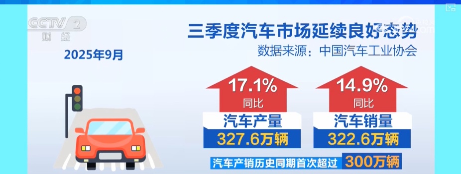 9月当月,汽车产销分别完成327.6万辆和322.6万辆,汽车产销历史同期首次超过300万辆,同比分别增长17.1%和14.9%。专家表示,车市“金九银十”表现有望延续。