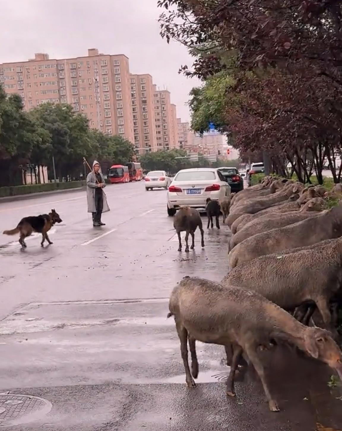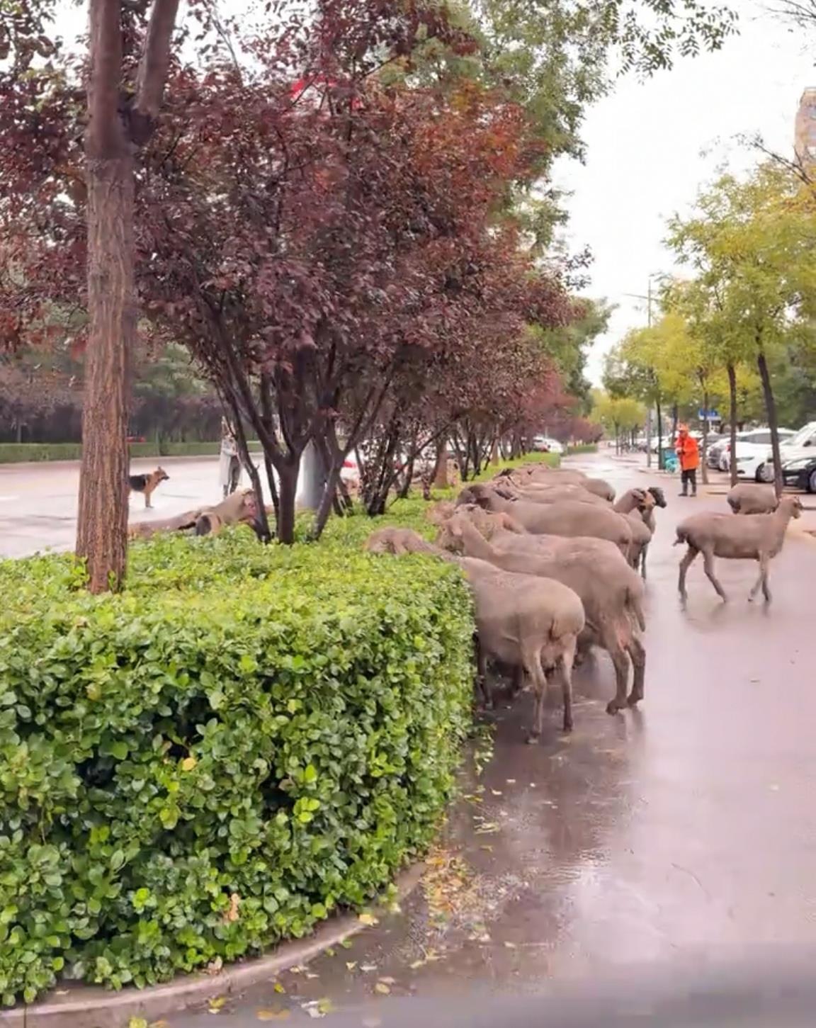 10月11日,有网友发视频称“太原城市街头真神奇,这是怎么了?”视频显示,天空中下着小雨,牧羊人穿着雨衣,扛着鞭子,带着猎狗,站在路中央,看着数十头羊正围着绿化带吃绿叶,绿化带两边车来人往。