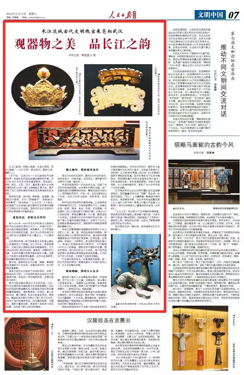 9月下旬,“江流万古——长江流域古代文明瑰宝展”在湖北武汉盘龙城遗址博物院开展。作为2025长江文化艺术季的重要展览,来自湖北、湖南、浙江、江苏、四川、重庆等9省市30多家文博单位的160件(套)文物精品汇聚于此,集中展现了长江文明的美学风格及其发展流变的历史脉络。