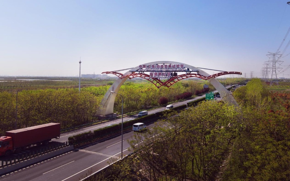 2025年4月15日拍摄的位于沪芦高速公路上的上海自贸试验区临港新片区的标志“海鸥门”(无人机照片)。新华社记者 方喆 摄