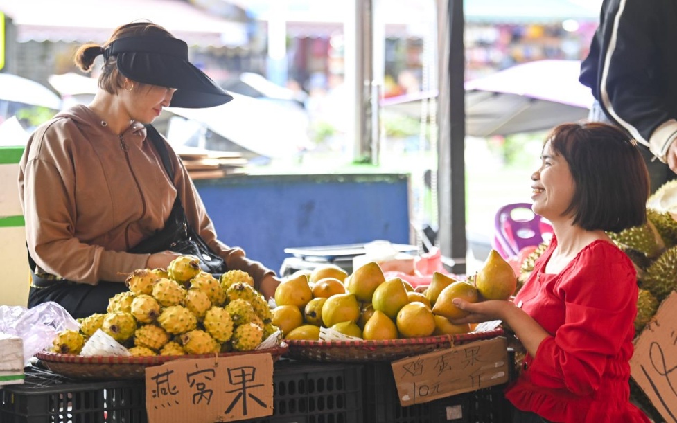 4月17日,在广西东兴口岸附近的一处水果市场,顾客在选购进口水果。新华社记者 曹祎铭 摄