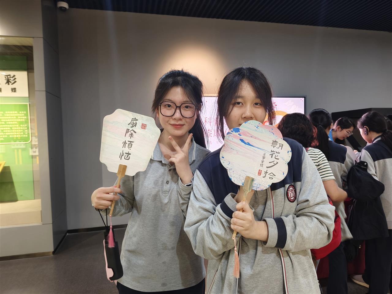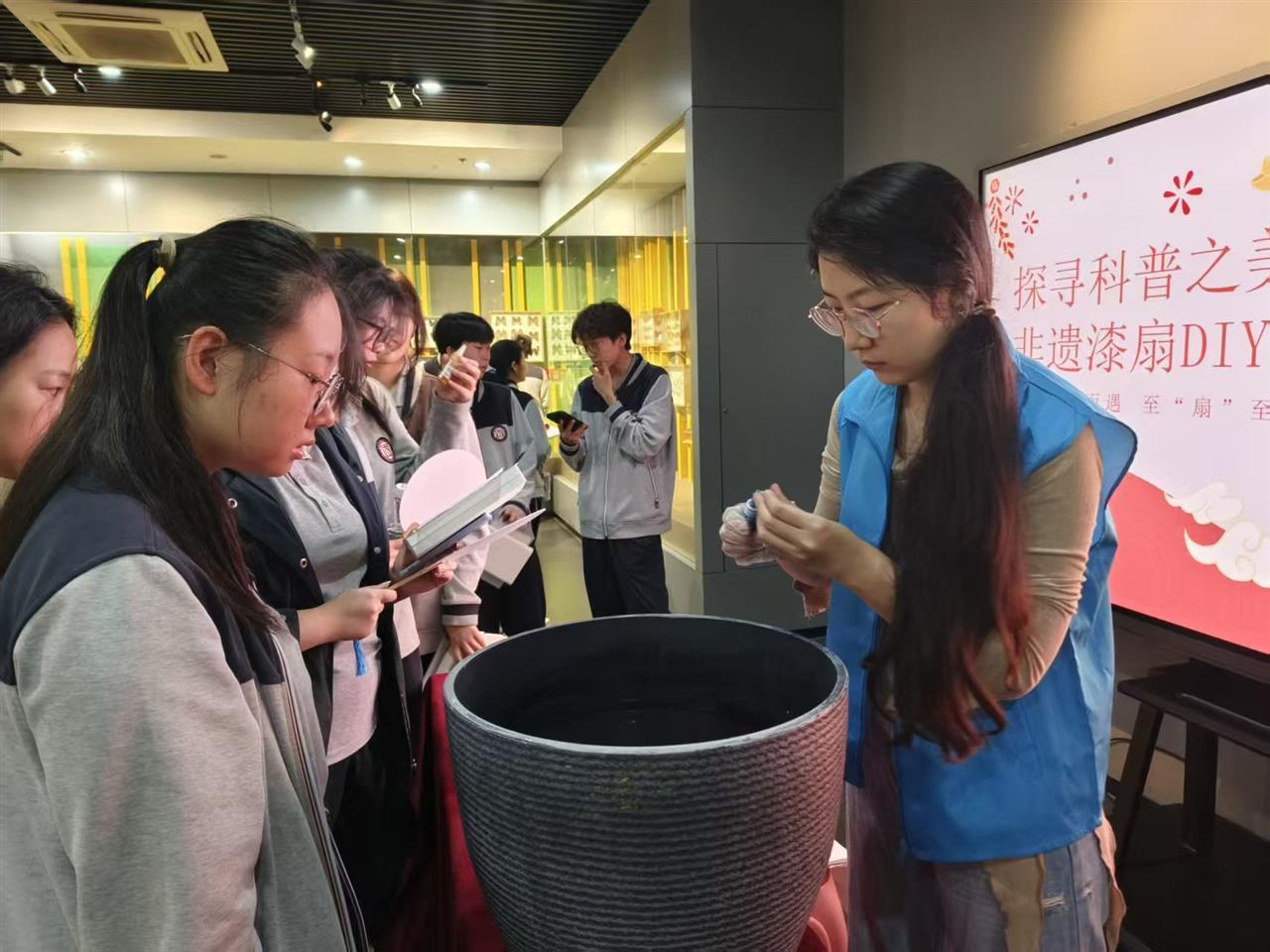 千年大漆入水,一旋成扇承古今!随后的漆扇制作体验,则将气氛推向高潮。同学们屏息凝神,将晶莹的大漆滴入水中,轻轻搅动,看色彩在水中晕染出万千姿态。再将素白的扇面浸入水中,旋转、提拉——每一次起落,都是一次与千年非遗的对话,一把把纹理各异、独一无二的漆扇跃然眼前。这不仅是一次奇妙的手工创作,更让来自首都的学子们亲身感受到了荆楚大地上非遗文化的深邃与魅力。