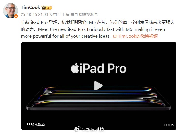 库克同时发文表示,全新iPad Pro登场,搭载M5芯片,“为每一个创意灵感带来更强大的动力”。