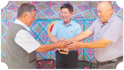 新疆伊宁市人民法院巴彦岱人民法庭“老法官说法”调解室促成纠纷当事人握手言和。 依力哈木·吐尔汗江摄 |