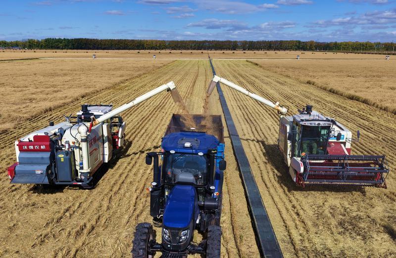 2025年10月8日,在黑龙江北大荒农业股份有限公司友谊分公司水稻地块,农机在集中卸粮(无人机照片)。新华社发(徐宏宇摄)