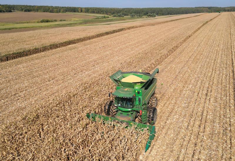2025年9月23日,在北大荒集团黑龙江建设农场有限公司第三管理区,农机在进行收获作业(无人机照片)。 新华社发(许颖献摄)