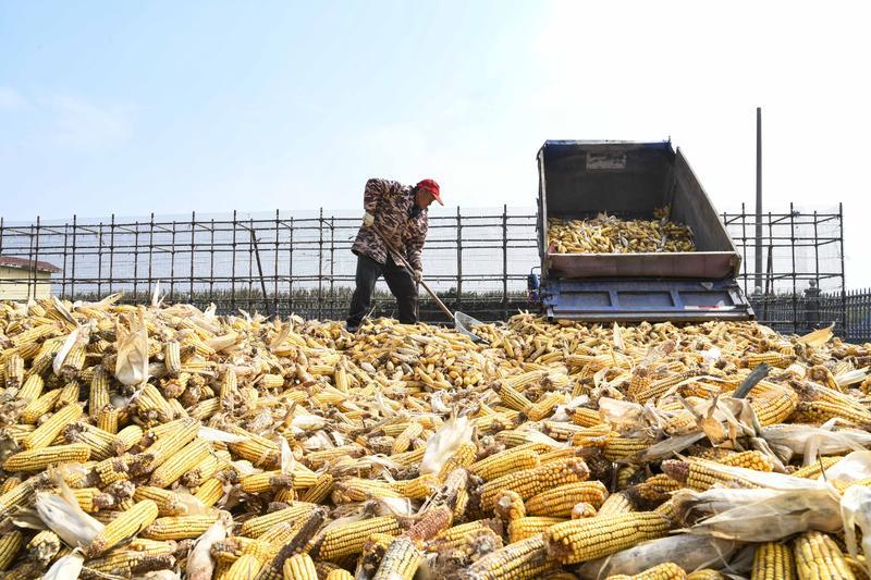 2025年10月14日,河南省济源市五龙口镇农民晾晒刚收获的玉米。新华社发(苗秋闹摄)