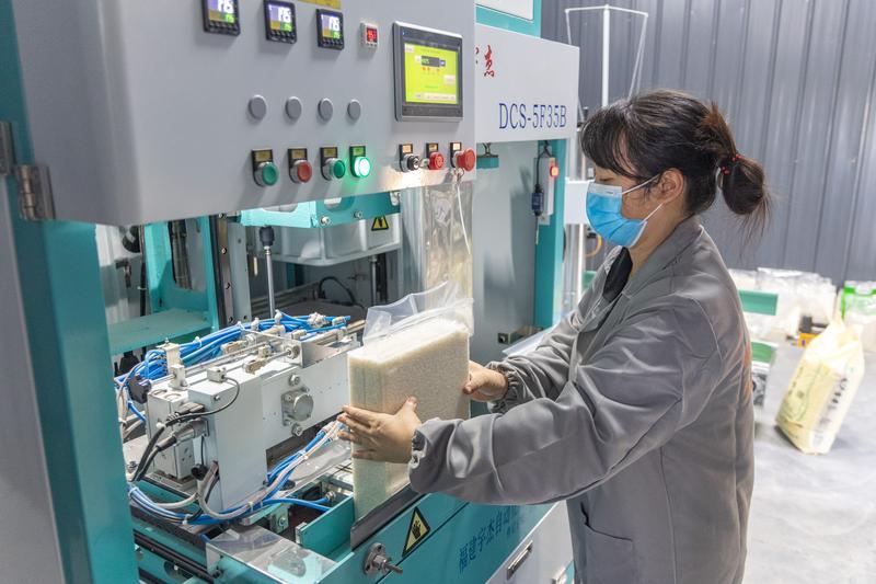 2025年10月11日,在重庆市永川区吉安镇寒泸村的永泸农事服务中心,工作人员将大米装袋密封。新华社记者 黄伟 摄