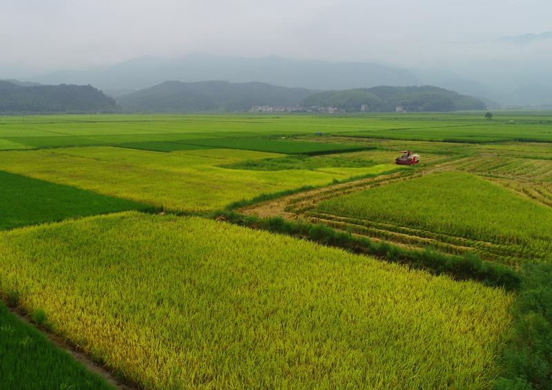 2025年8月31日,在福建省南平市浦城县仙阳镇,村民驾驶收割机在田间作业(无人机照片)。新华社发(黄杰敏摄)