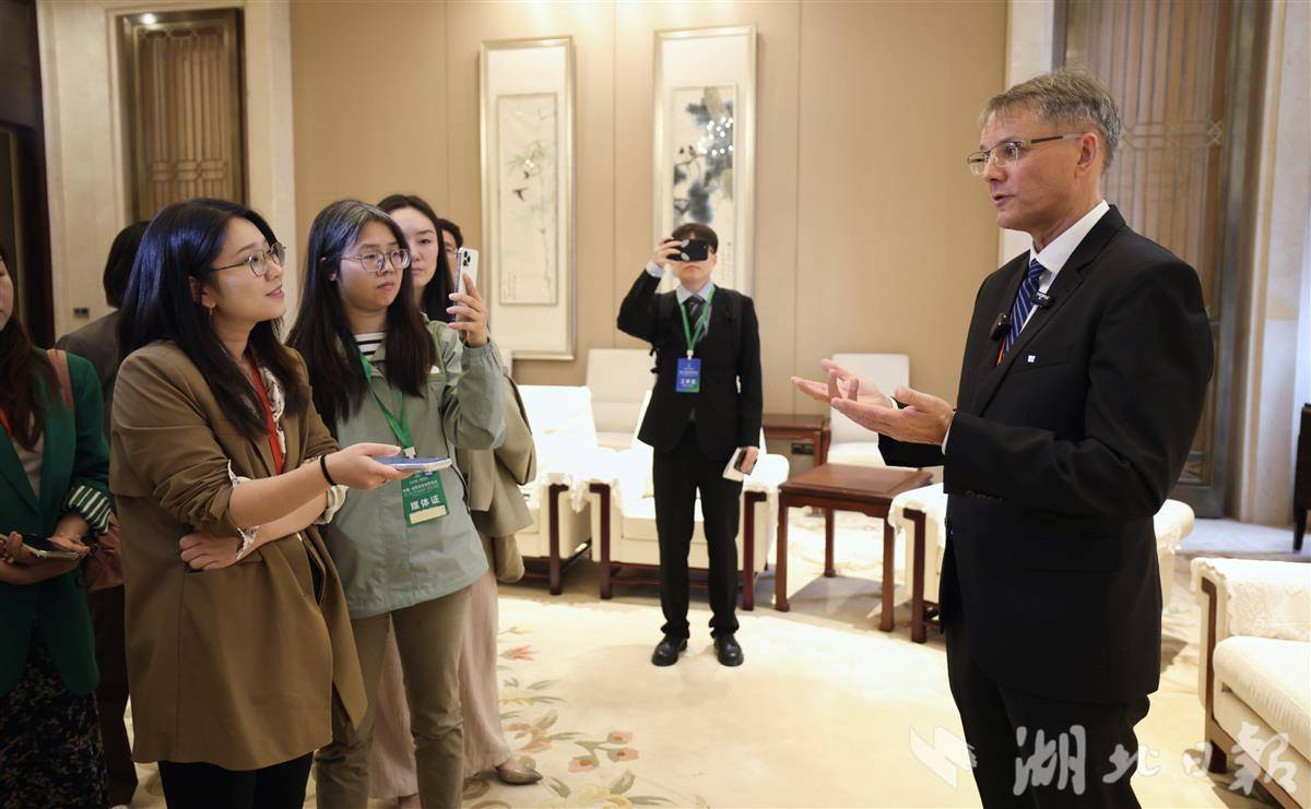 外国嘉宾正在接受湖北日报全媒记者采访。(记者陈少哲摄)