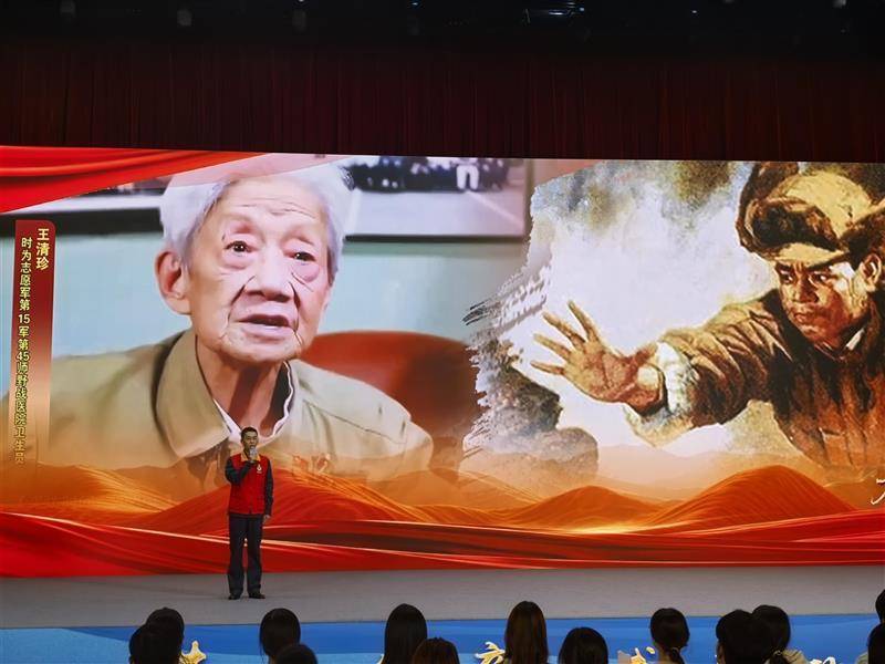 国家电网孝感供电公司刘航的动情讲述,将现场学子带回到上甘岭的峥嵘岁月。通过其奶奶王清珍——战地护士“王兰”原型的感人故事:14岁参军、16岁赴朝,王清珍在坑道内七天七夜未眠,用嘴为伤员吸尿、用生命守护战友。她为黄继光整理遗体的经历,更是让现场学子深受震撼。刘航说,他将奶奶的信念融入电力保供一线,让上甘岭精神在新时代继续发光。