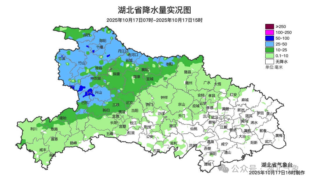 10月17日20时至18日8时,鄂西南阴天有中到大雨,局地暴雨;江汉平原、鄂东北阴天有小到中雨,局地大雨;其他地区阴天有小雨。最低气温14~18℃,偏北风3到4级、阵风5到8级。