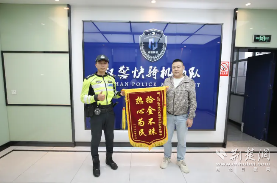 荆楚网(湖北日报网)讯(通讯员廖慧 刘泽)10月16日下午,武汉市江汉区公安分局交通管理大队院内,市民余女士的丈夫手持一面写有“拾金不昧 热心为民”的锦旗,亲手交到快骑机动队员范筱节手中,再三对其拾金不昧的行为及江汉公安高效为民的办事效率表达感谢。
