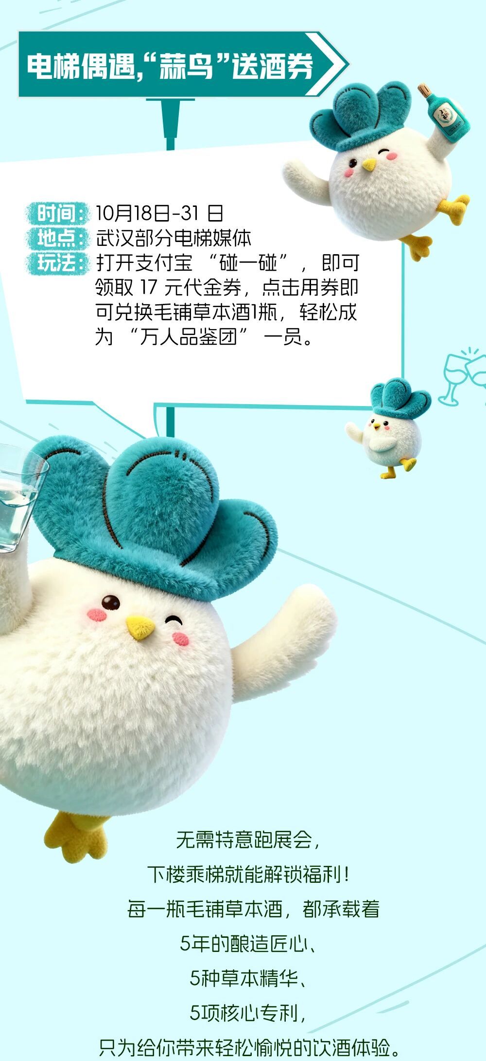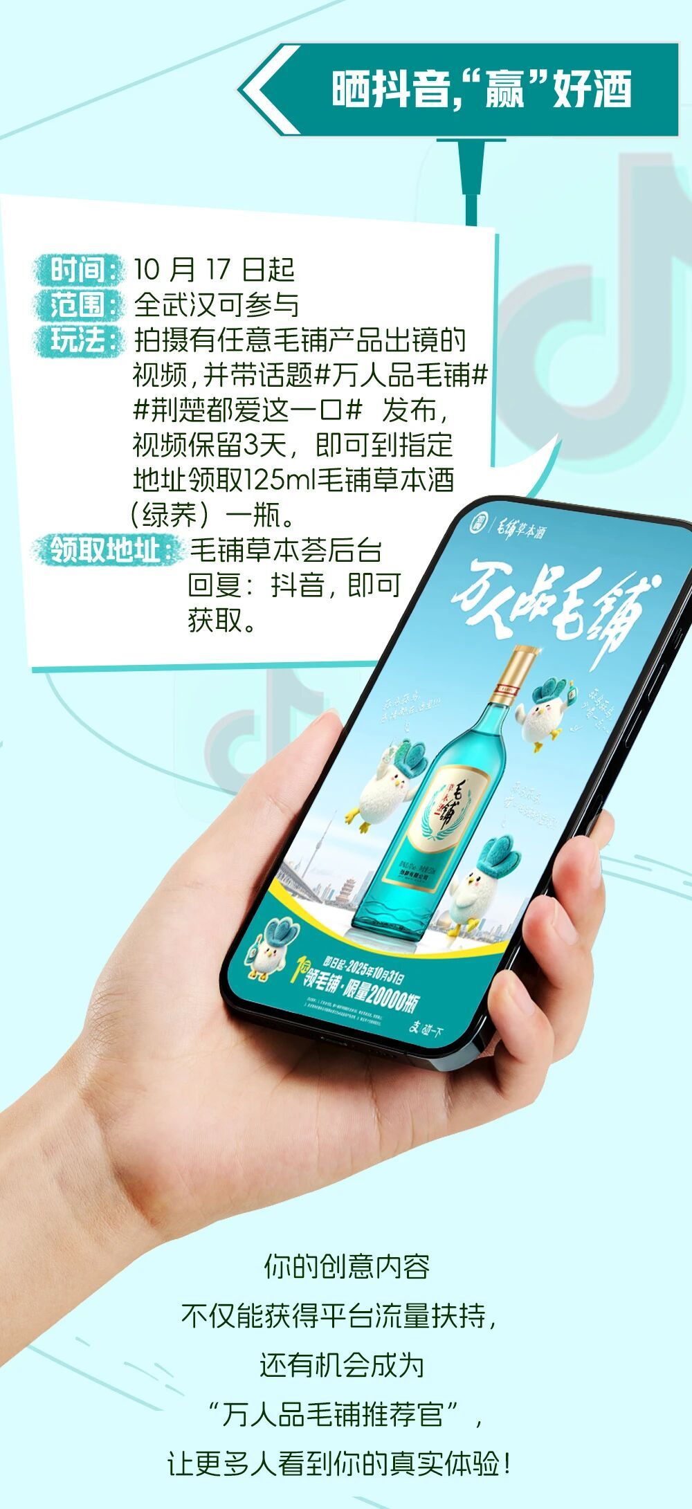 线上环节同样精彩纷呈,消费者可通过武汉部分电梯内的碰一碰广告领取毛铺草本酒17元代金券,并在毛铺淘宝官方旗舰店支付1元获得价值18元的125ml毛铺草本酒1瓶;同步联合湖北区域办发起#万人品毛铺#抖音互动话题,按要求参与话题互动即可在指定门店领取毛铺草本酒。