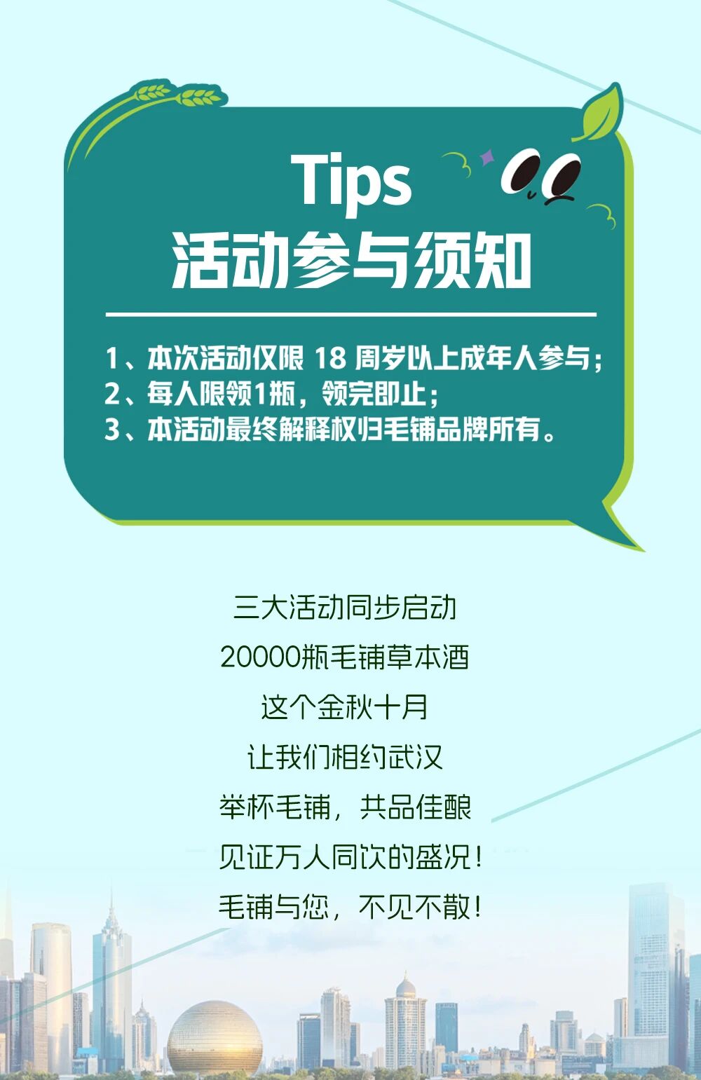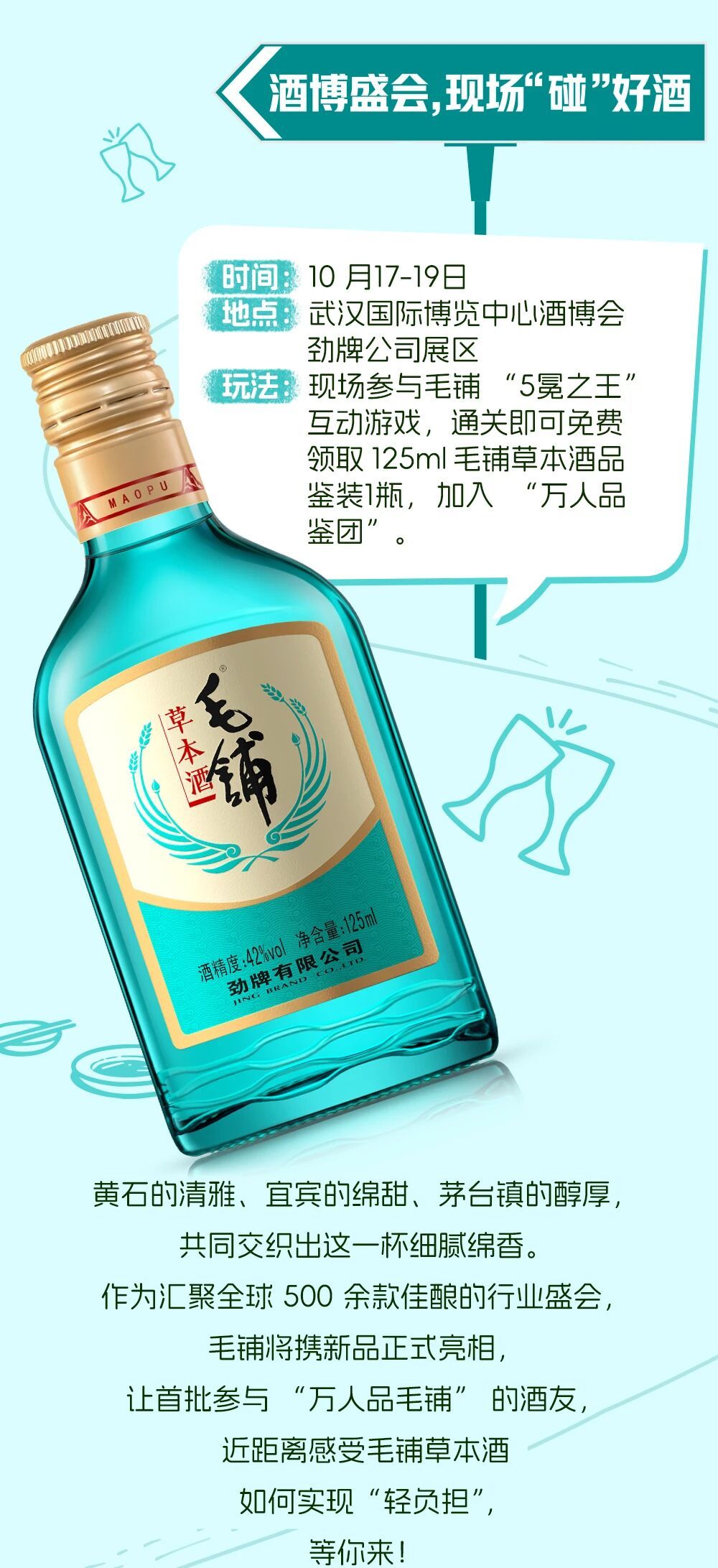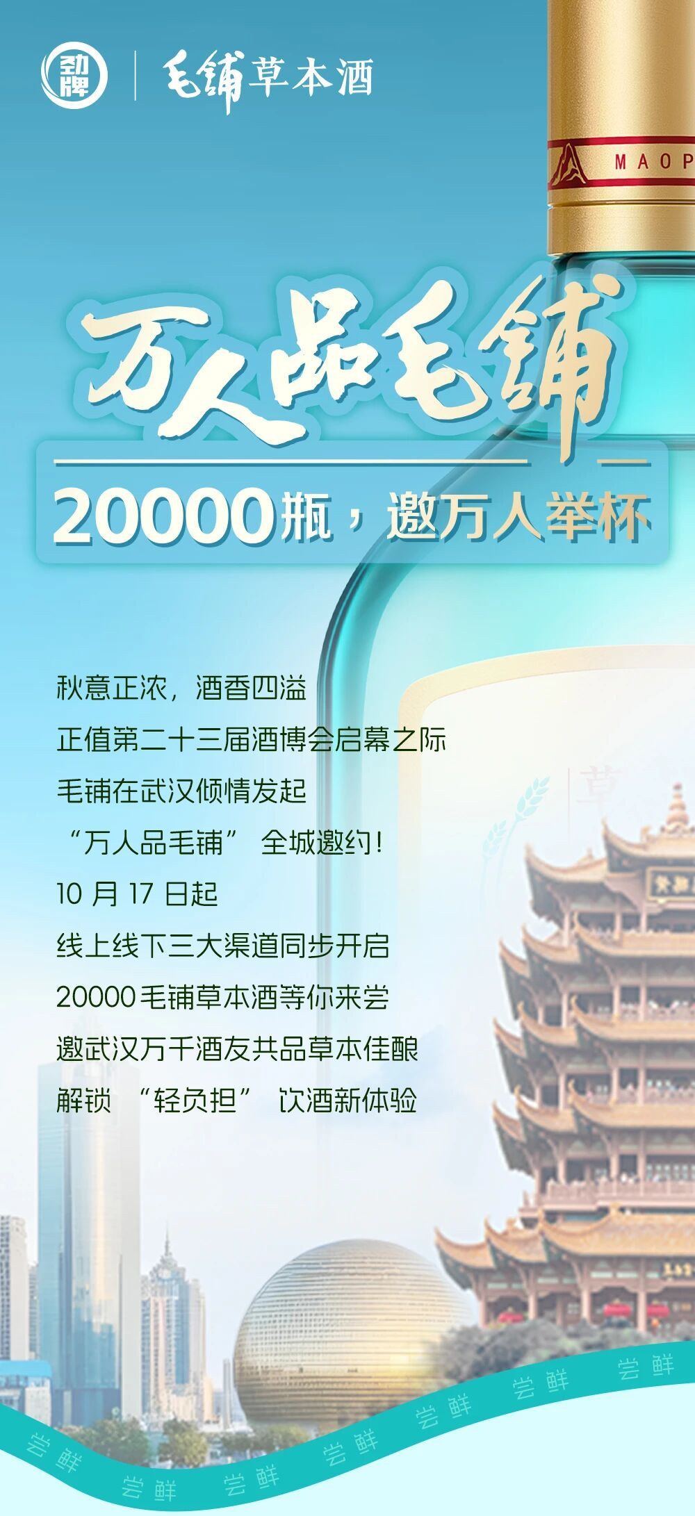 据了解,10月17日至11月1日期间,劲牌公司在武汉发起“万人品毛铺”邀约品鉴活动,通过线上线下结合的方式,发放2万瓶毛铺草本酒,旨在推广健康饮酒理念,提升消费者对毛铺新品认知度。