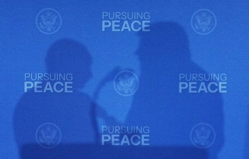 8月15日,美国总统特朗普(右)与俄罗斯总统普京在美国阿拉斯加州安克雷奇市埃尔门多夫-理查森联合军事基地举行会晤后共同出席联合记者会时身影映在现场。新华社记者吴晓凌摄
