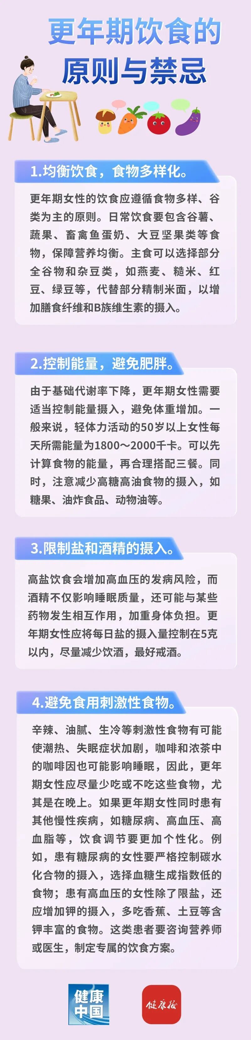 女性步入更年期,卵巢的内分泌功能会逐渐衰退,雌激素水平随之波动式下降,进而引发一系列身体变化。数据显示,女性在更年期每年骨量流失1%~2%,若不加干预,之后患骨质疏松症的风险将大大增加。同时,雌激素水平降低还可能影响血脂代谢,使得心血管疾病的发病率上升。此外,更年期女性的基础代谢率平均降低5%~10%,这意味着身体消耗能量的能力减弱。如果仍然保持以往的饮食习惯,很容易导致体重增加、脂肪堆积。因此,在饮食调节上,不仅要补充特定的营养素,还要合理控制能量摄入。