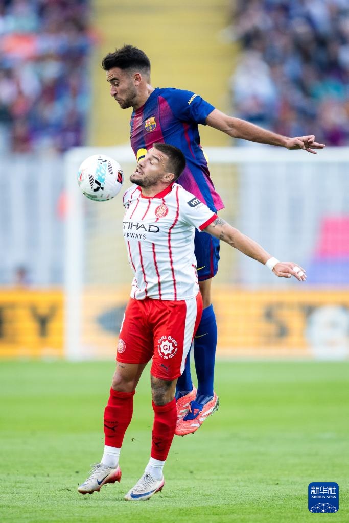 10月18日,巴塞罗那队球员巴尔德(右)与赫罗纳队球员布莱恩·希尔在比赛中拼抢。