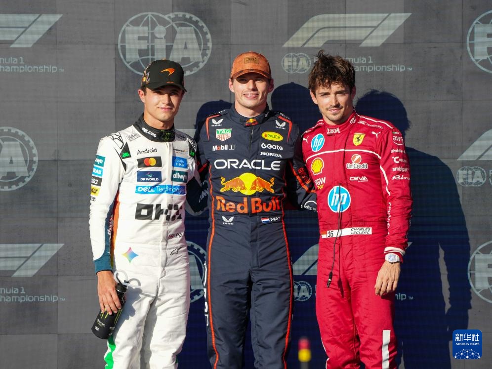 10月18日,获得杆位的红牛车队荷兰车手维斯塔潘(中)、第二名迈凯伦车队英国车手诺里斯(左)和第三名法拉利车队摩纳哥车手勒克莱尔在颁奖仪式上合影。