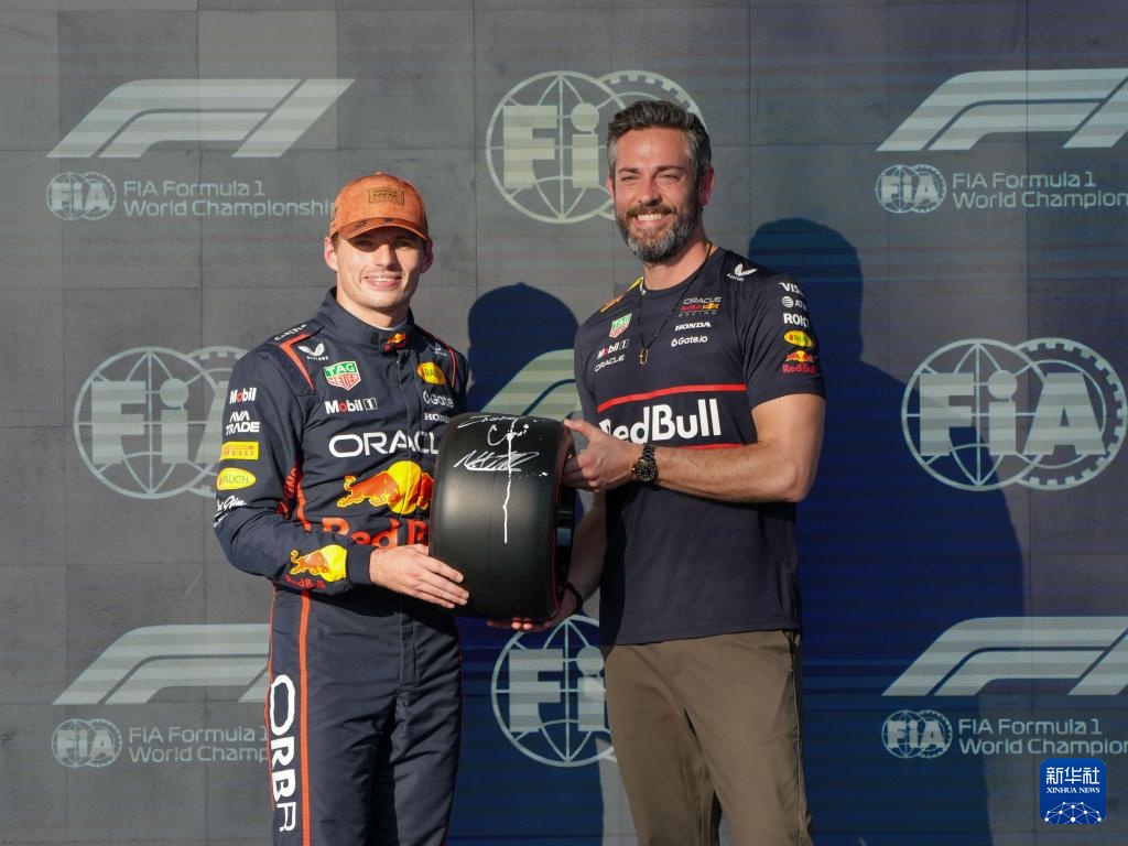 10月18日,夺得杆位的红牛车队荷兰车手维斯塔潘(左)在颁奖仪式上。