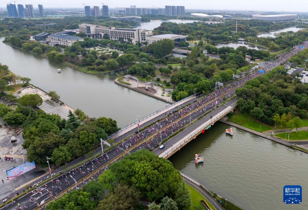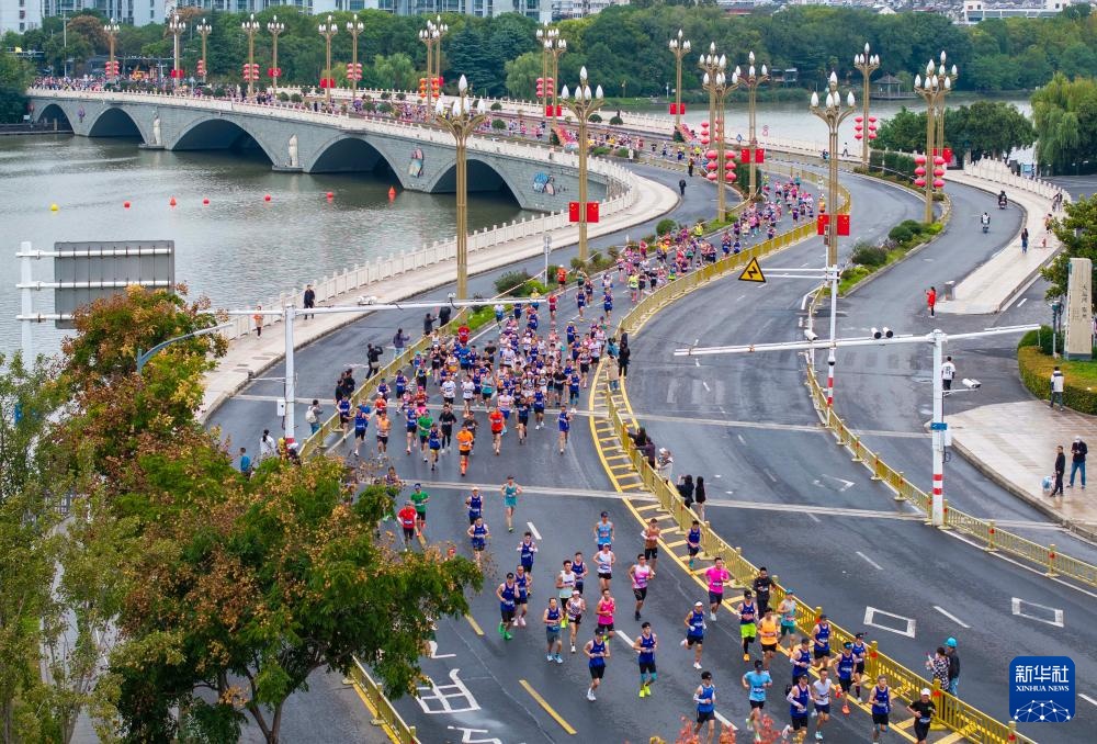 10月19日,选手从江苏泰州体育公园西门出发(无人机照片)。