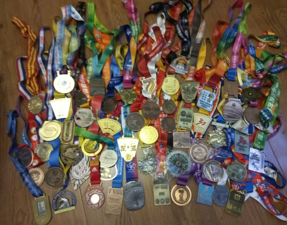 周勇到各地参加马拉松赢得的奖牌。(受访者供图)