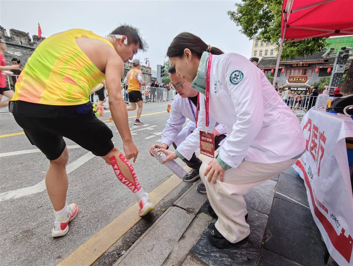 襄阳市中心医院医护人员正在为参赛选手喷洒运动降温冰肌喷雾。(通讯员 肖清心 摄)