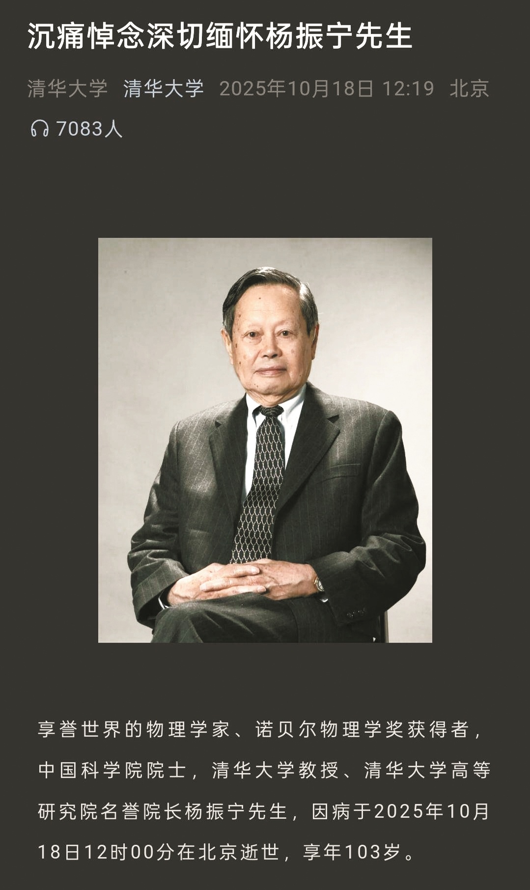 2025年10月18日,享誉世界的物理学家、诺贝尔物理学奖获得者、中国科学院院士、清华大学教授、清华大学高等研究院名誉院长杨振宁先生逝世。极目新闻记者梳理发现,截至19日晚上,目前国内已有清华大学、北京大学、复旦大学、上海交通大学、华中科技大学等在内的至少23所高校发文悼念。清华大学、香港中文大学等多所高校官网已变黑白。