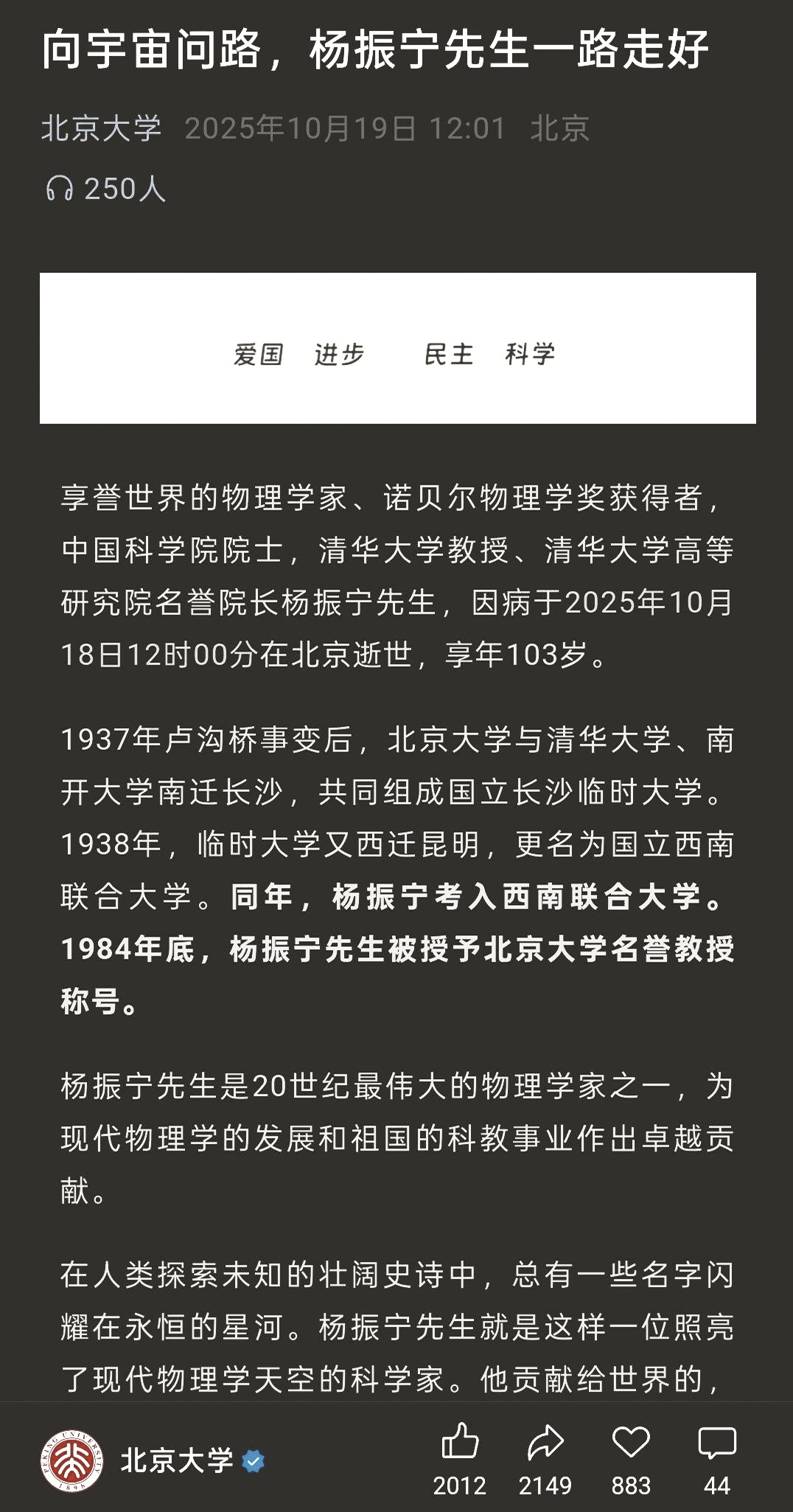 北京大学发文缅怀杨振宁先生 来源:学校官方微信
