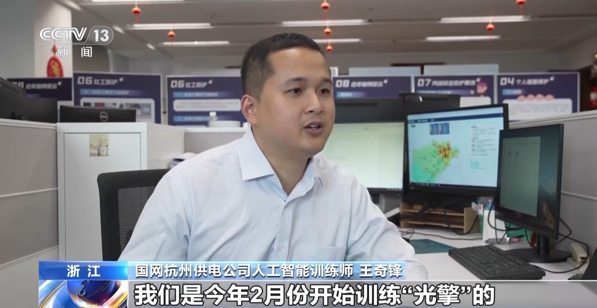 国网杭州供电公司人工智能训练师 王奇锋:我们是今年2月份开始训练“光擎”的。我们要把杭州全市6000多万字符数的电网结构,还有电压、电流、气象等信息转化为大模型可以理解的语言。