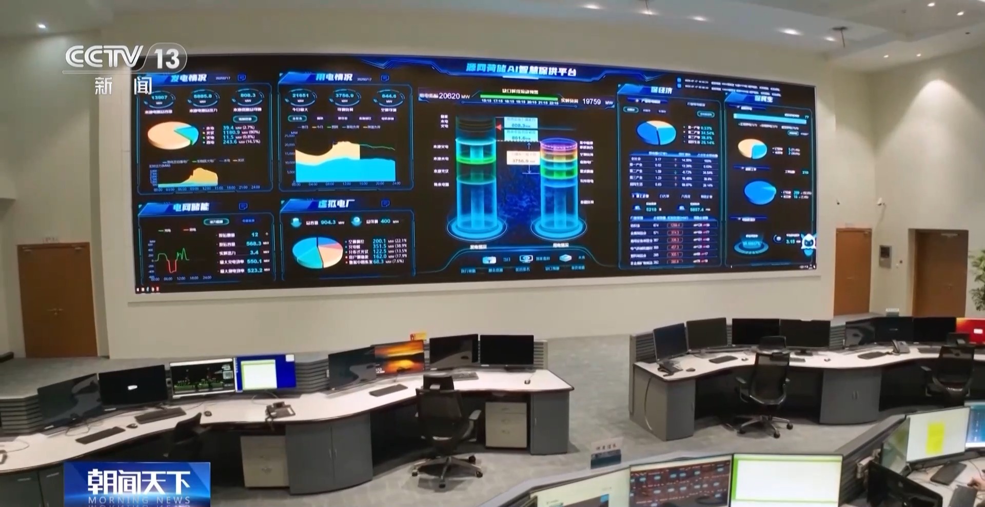 来到电力调度大厅,大屏幕上是各种数据和图表,实时显示出当前全市发电、用电、储能等电网运行的情况。