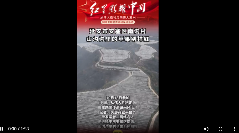 秋日的延安市安塞区南沟村,漫山果园里红彤彤的果实压弯枝头。谁能想到,这片曾经的撂荒地,如今靠着一棵棵矮化苹果树,结出了村民的“幸福果”,蹚出了一条乡村振兴的好路子。10月18日,参加“红星照耀中国:从伟大胜利走向伟大复兴”网络主题宣传调研采风活动的媒体记者、头部商业平台负责人、专家学者、网络名人走进延安市安塞区南沟村,探索山沟沟里的苹果为何那样红?