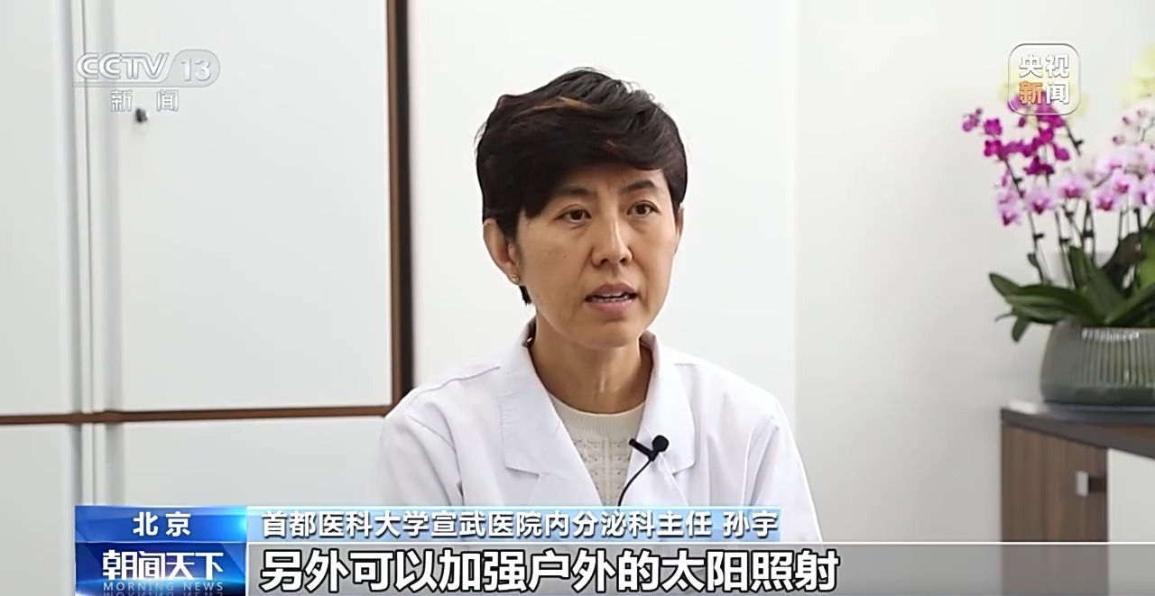 首都医科大学宣武医院内分泌科主任 孙宇:进行肌肉力量的训练,另外可以加强户外的太阳照射,这些措施都有助于维持比较好的肌肉质量以及比较恒定的维生素D的水平。每年做一次骨密度的检测,这样可以有助于及早发现骨量减少或者是诊断骨质疏松。