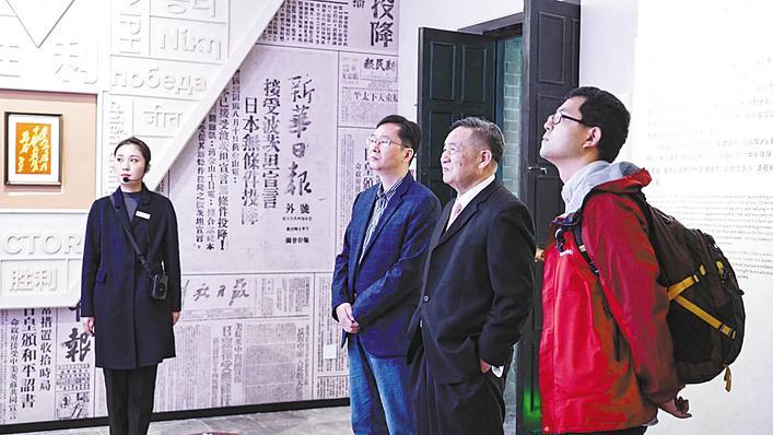 日本《赤旗报》记者小林拓也(右一)与陈德(右二)一同参观八路军武汉办事处旧址纪念馆。(湖北日报全媒记者 涂家骏 摄)
