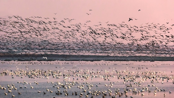 龙感湖湿地总面积7749.12公顷,是长江中下游湿地网络的关键节点。其主要保护对象包括长江中下游淡水湖泊湿地生态系统,和青头潜鸭、东方白鹳、白头鹤等珍稀濒危物种及其栖息地,以及野菱、粗梗水蕨等珍稀野生植物。近年来,有关部门通过实施湿地修复、水质改善、生态监测等系列举措,龙感湖湿地生态环境持续向好,已成为众多候鸟迁徙的中转站和越冬地,每年在此栖息的鸟类数量稳步增长,珍稀物种出现频次显著增加。