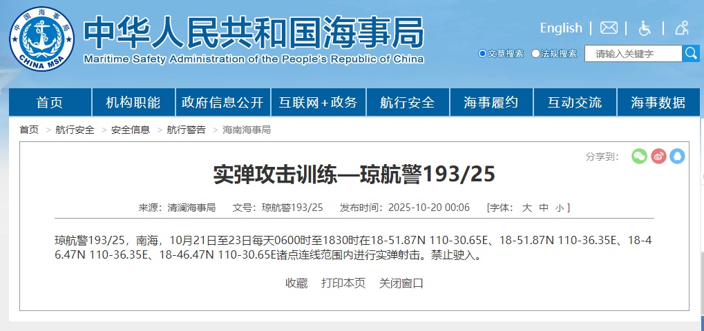 据中国海事局网站消息,清澜海事局发布航行警告,10月21日至23日每天6点至18点30分,南海部分海域进行实弹射击,禁止驶入。