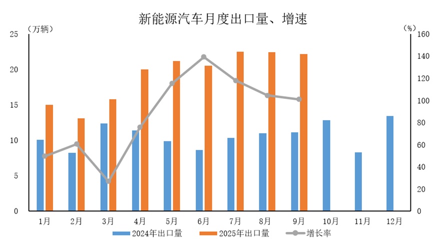 2025年1-9月,新能源汽车出口175.8万辆,同比增长89.4%。