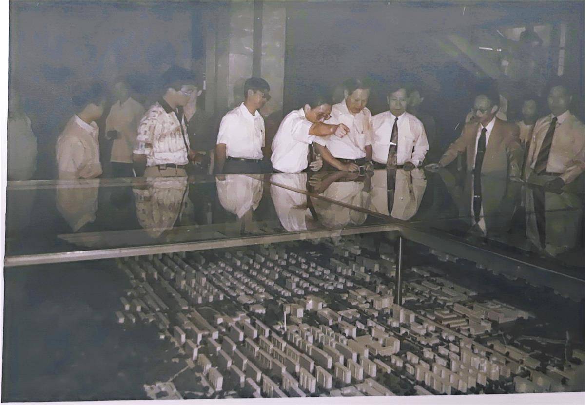 (图为杨振宁先生在学校全景沙盘前听取校党委副书记冯向东介绍情况)