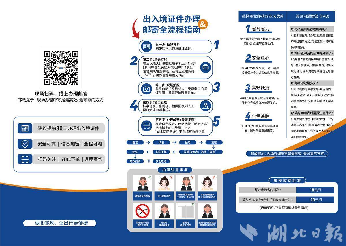 此间,全省年满60周岁的老年申请人办理出入境证件时,均可享受“一免三优”的全流程便利服务。“一免”即提供出入境证件免费寄递到家服务,“三优”指优先取号、优先办理和优先寄递。老年市民朋友可在全省各级出入境办证大厅窗口,扫描“银发”寄递“专属二维码”,免费办理出入境证件邮寄业务。证件制作完成后,湖北邮政将通过特快专递邮件寄送至指定地址,邮件相关物流轨迹可通过“EMS中国邮政速递物流”或“湖北便民寄递”微信小程序点击“查件”进行查询。