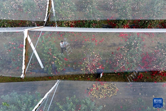 果农在延安市宝塔区桥沟街道烟洞沟村苹果园内劳动。图源:新华社