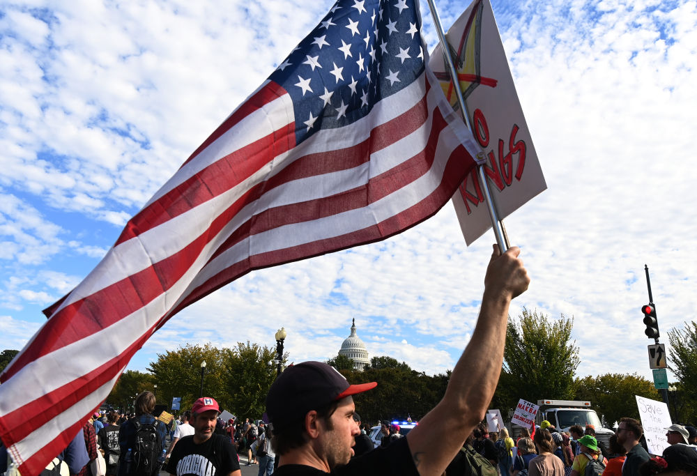 10月18日,在美国华盛顿,人们参加示威游行活动。新华社记者李睿摄