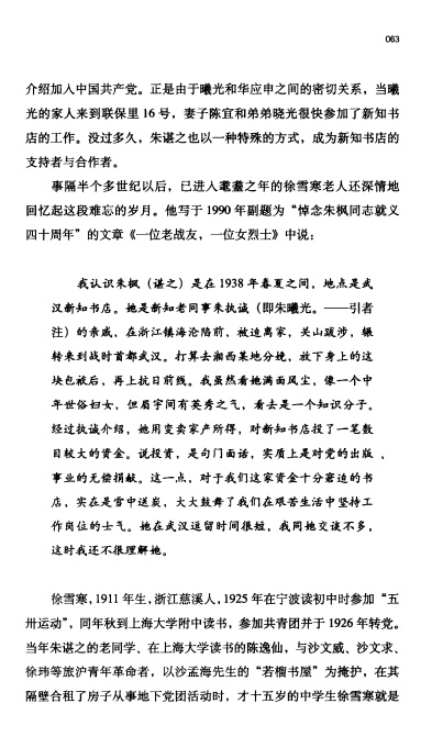 老共产党员徐雪寒曾在回忆文章中佐证了这段历史,他写道:“她虽然满面风尘,像一个中年世俗妇女,但眉宇间有英秀之气,看去是一个知识分子……”他特别提到,朱枫的捐赠实为对党的出版事业的无偿奉献,“大大鼓舞了我们在艰苦生活中坚持工作的士气”。