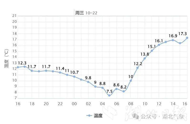 湖北日报讯(记者曾莉)10月22日,湖北终于放晴,气温开始回升,武汉早晨以7.4℃再创下半年新低后,白天又一路飙升至17℃以上。预计23日全省晴朗少雨,最高气温进一步回升至17至21℃。24至25日全省转为多云或阴天,部分地区还会有小雨出没,气温将有小幅下滑。