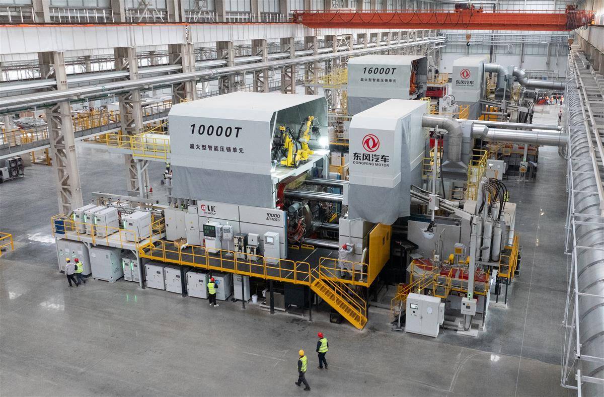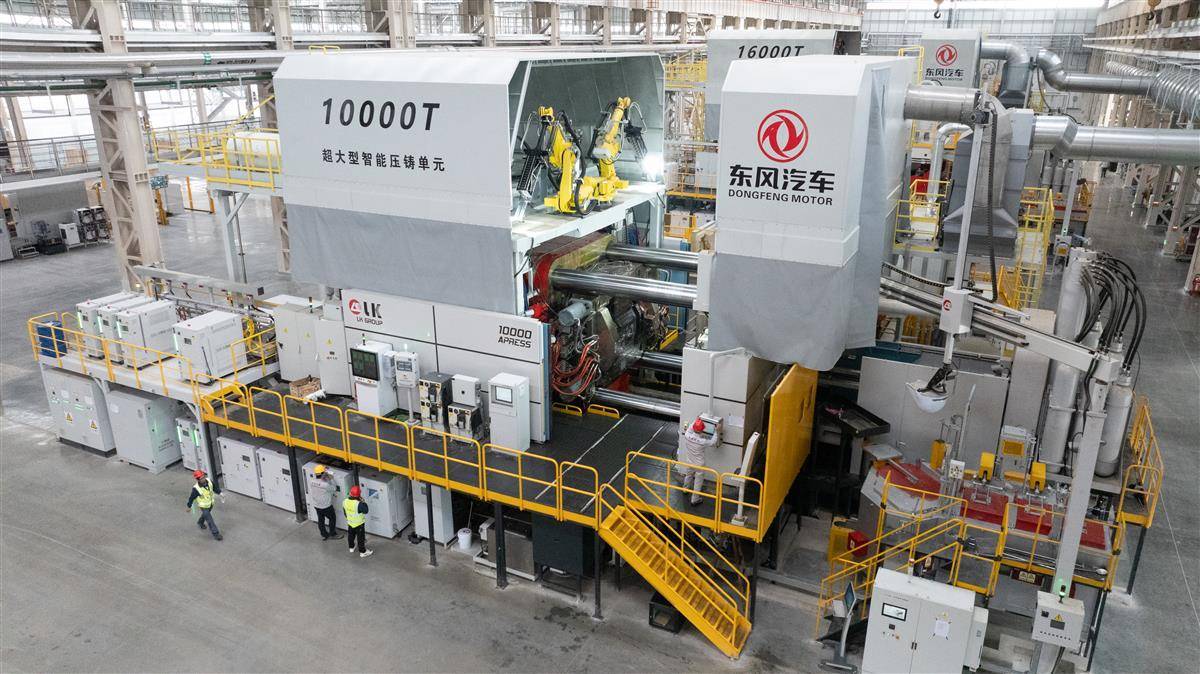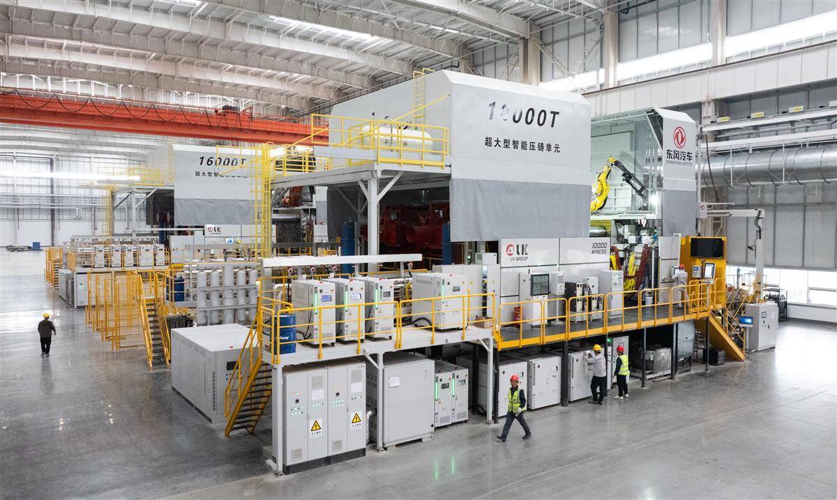 东风汽车一体化压铸产业化项目是新能源汽车领域的关键制造技术项目,包括全球首条16000吨及10000吨一体化压铸双产线,是全球最大吨位压铸机工厂。它能把原本需要数百个零件焊接的新能源车电池托盘,用万吨级压铸机“一键成型”,把整个底盘一次性“压”出来,这样不仅车身更轻、更坚固,还省了大量焊接工序。(湖北日报全媒记者 柯皓 摄)